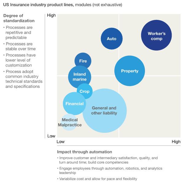 任何IPA應(yīng)用都是短期利益與更大的長(zhǎng)期發(fā)展相結(jié)合的。應(yīng)該根植于對(duì)產(chǎn)品的特點(diǎn),與是否適合自動(dòng)化,來重新設(shè)計(jì)并構(gòu)建詳細(xì)的路線圖,并重新設(shè)想團(tuán)隊(duì)?wèi)?yīng)該以何種方式工作來創(chuàng)造價(jià)值。 例如,每個(gè)保險(xiǎn)產(chǎn)品線都有不同程度的標(biāo)準(zhǔn)化和自動(dòng)化潛力,需要對(duì)他們進(jìn)行考察(如圖2)。一些時(shí)間密集型工作例如銷售,承保和定價(jià),政策管理,索賠和財(cái)務(wù)等,就很適合使用IPA,當(dāng)決定這些工作未來都如何進(jìn)行之后,就從頭開始構(gòu)建。